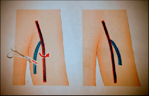 大伏在静脈VCFは離断した大伏在静脈の切離断端と皮膚との間に瘻孔を作成し、そこから毎透析ごとに針を大腿静脈まで挿入し脱返血を行う方法です。