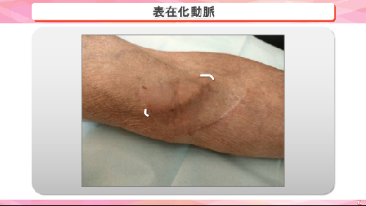 通常のシャントでは静脈に針を刺して透析しており、動脈に穿刺することはありませんが、シャントが作れない場合、針を刺す静脈が無い場合、動脈に直接穿刺して透析をすることがあります。