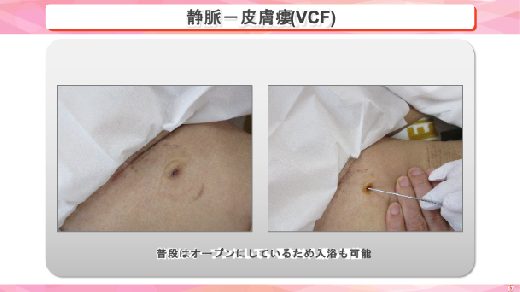 大伏在静脈VCFは離断した大伏在静脈の切離断端と皮膚との間に瘻孔を作成し、そこから毎透析ごとに針を大腿静脈まで挿入し脱返血を行う方法です。